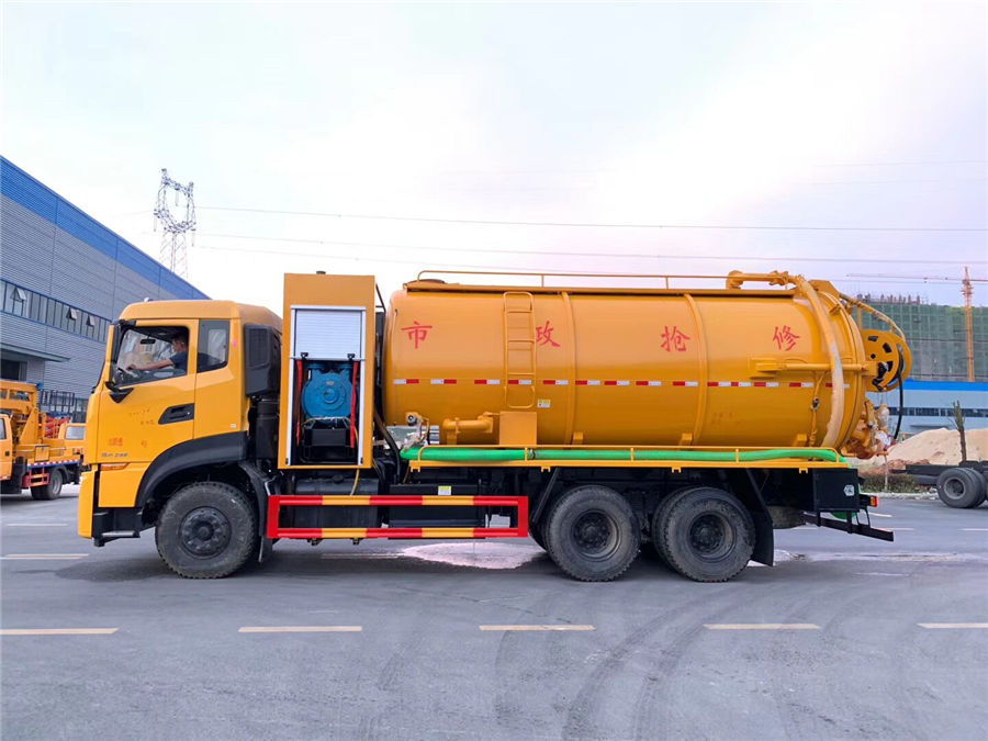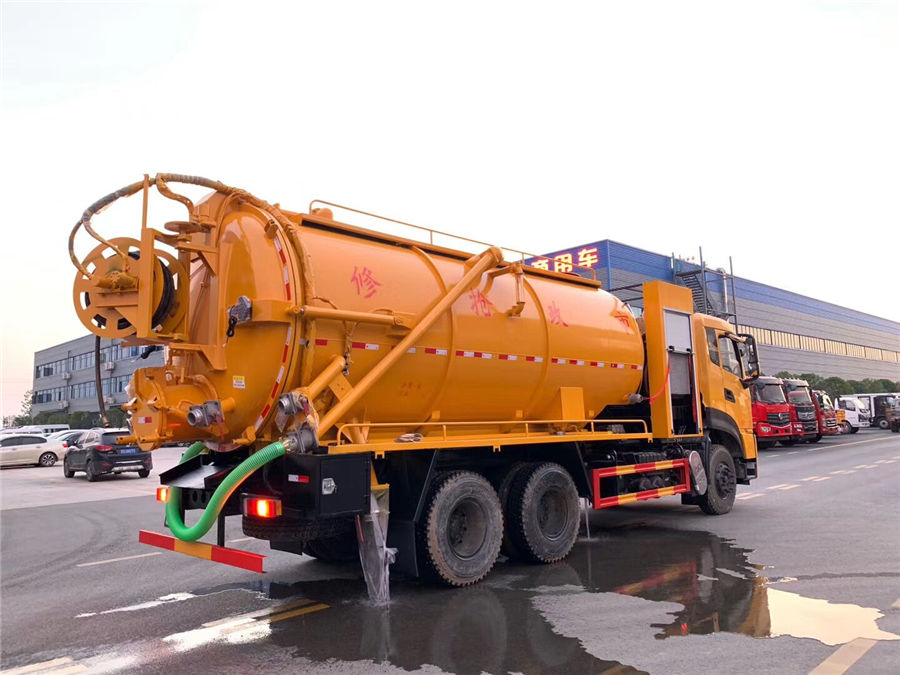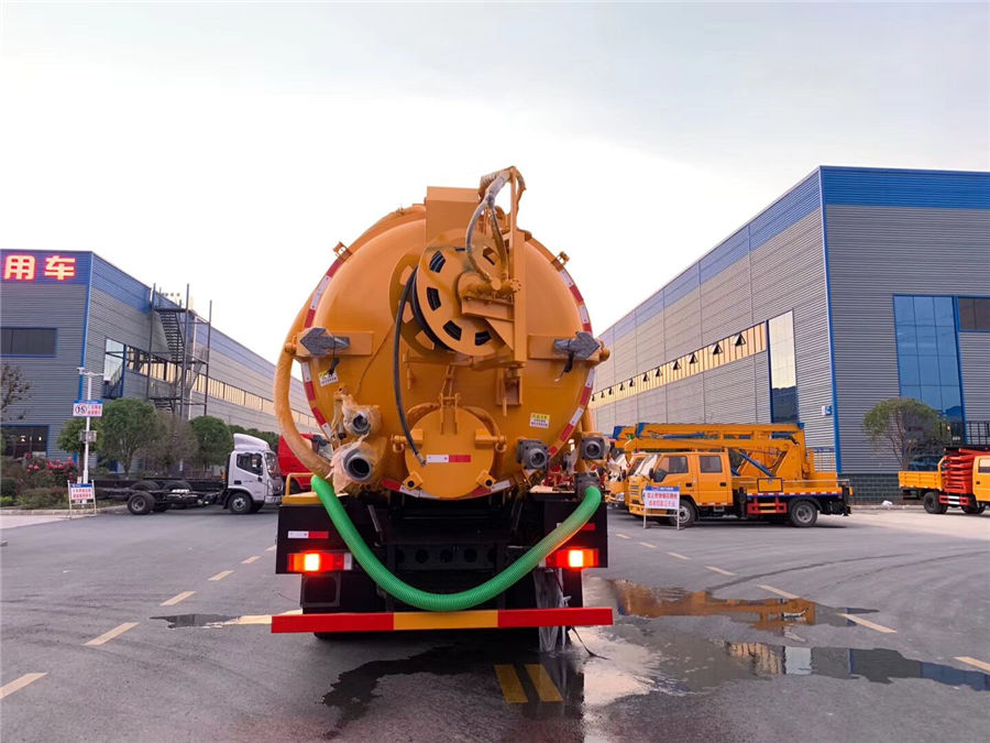 罐体部分:22立方,罐体内底部加装不锈钢底板1.2米宽,顶部两侧做碳钢防滑平台护栏,罐体及封头厚度:8mm,清水罐用污灌口做,污水罐用水泥罐口,清水罐消防栓进水口在副驾驶一侧《两头用接口,中间用白色软管连接》,水污互通,视粪窗左右各一个,清水罐、污水罐内各做爬梯一个,副梁选用橡胶垫,中置顶,安装限位阀。后封头可旋转齿轮自动液压绞盘,标配通径22高压管60米,耐压22mpa,后封头下部开600mm内通径液压排污口1个,后盖左下6寸排污阀1个,后盖右下4寸排气阀1个,4寸吸污阀1个,副发进气管用125mm,不锈钢水箱做0.8方,1个工具箱《尽量做大》,防溢流装置,后尾部装双箭头灯,清水罐顶部装排气阀1个,清水罐底部装4寸排水阀1个,出水管在清水罐里面装75mm阀门,出水管用89mm管。